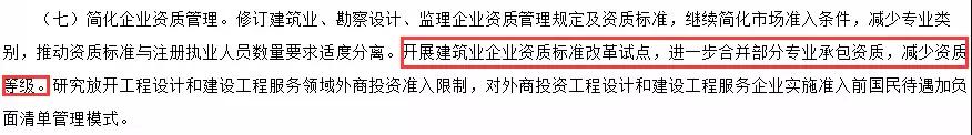 《2018年工作要點(diǎn)》中明確表示:繼續(xù)簡(jiǎn)化市場(chǎng)準(zhǔn)入條件,減少專業(yè)類別;開(kāi)展建筑業(yè)企業(yè)資質(zhì)標(biāo)準(zhǔn)改革試點(diǎn),進(jìn)一步合并部分專業(yè)承包資質(zhì),減少資質(zhì)等級(jí)。